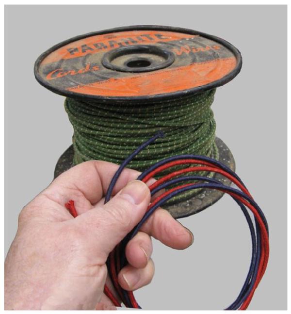 Once the bundle of wires is gathered into parallel alignment and secured by a spiral wrap of thread, it can be placed into the braiding fixture. In this case, about 36” of the bundle needs to have the braided jacket. To do the braiding takes about 8 hours work but the results are quite good. Good enough such that viewers are not likely to spend time questioning if the cable is not just ‘new old stock’ cable of the correct style.