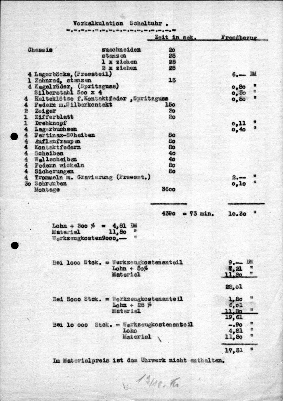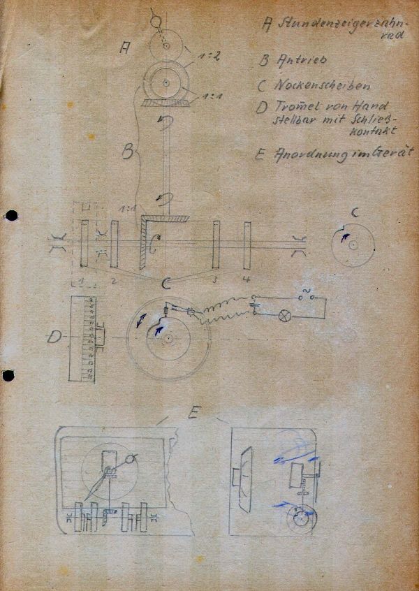 Ein vor dem Lautsprecher zentral angebrachtes Synchronuhrlaufwerk treibt zusätzlich die Schaltmechanik an. Die Dokumente unter Gerät zeigen das Prinzip. Im Unterschied zum realisierten Gerät sind keine Schaltnocken mit unabhängigen Schaltern in den Einstellrädern wie abgebildet, sondern Schleifkontakte schließen den Stromkreis über Bleche in den Rädern und die gemeinsame Achse. Hier links die Entwurfskizze.