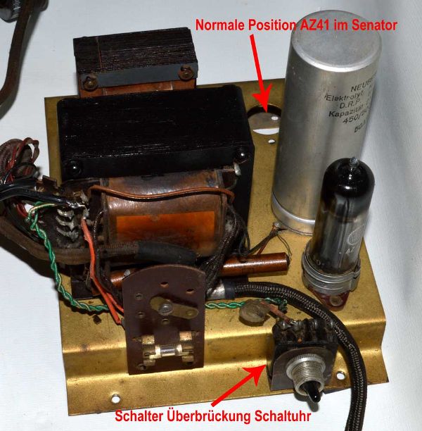 dem Lautsprecher eingebaut wurden. Dadurch liegt der Lautsprecher etwas nach hinten verschoben und im Netzteil musste dadurch die AZ 41 in das Montageloch nach hinten gesetzt werden. Das wurde aber offensichtlich aus unbekannten Gründen auch bei den Netzteilen des normalen „Senator“ unterschiedlich gemacht. (sieh Bilder hier im RM.org unter Wobbe Senator) Das Chassis des Netzteiles enthält offensichtlich zwei Montagelöcher für die Gleichrichter- Röhre.