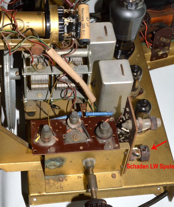 Das Netzteilchassis ist offensichtlich leicht modifiziert, da der Lautsprecher durch die Schaltmechanik leicht nach hinten verschoben ist. Auf dem Chassis fielen von oben zwei Defekte auf. An der LW-Spule har eine Zuleitung abgerissen und eine Keramikscheibe des Wellenschalter war in der Halterung gesprungen. Sie wurde mit einem Tropfen Epoxidkleber wieder fixiert.