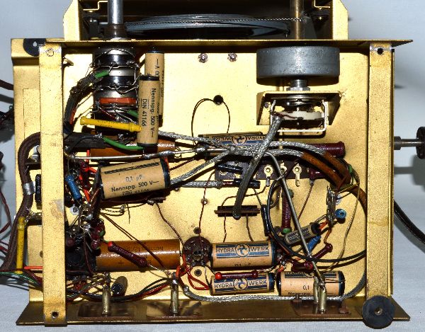 Das Gehäuse war verschmutzt und leichter Flugrost an den Schellen der Rimlockröhrenfassungen und Trafo zeigten, dass es feucht gestanden hatte. Die Kratzer im Lack hielten sich in Grenzen und nach der Reinigung wurde es mit Schellack nachpoliert.