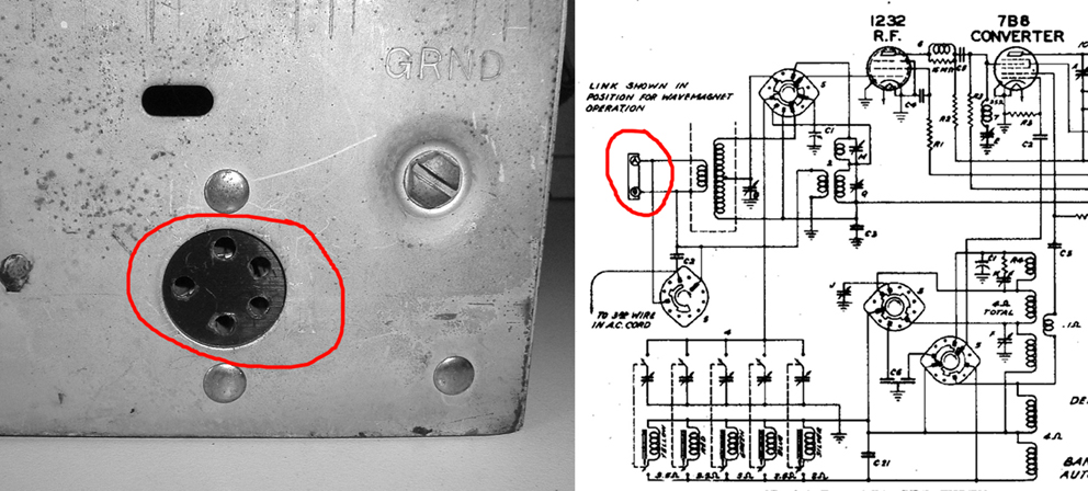 I have a Zenith 7A02 chassis for restauration here. I dowloaded the circuit diagram for this set, and it appears that there is an important difference between this diagram and the chassis i have here. The diagram mentions only two connection points A and G, but the rear ot the radio has a 5-pin connector for the antenna.