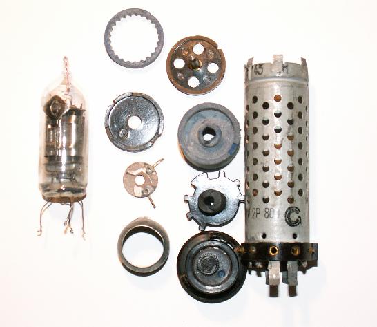 Hallo, es könnte sich um das System einer RL2P3 handeln. Wenn diese Röhre "ausgepackt" ist, könnte sie so aussehen. Die Heizung braucht 1,9 V, 0,285 A. Zwei Vorwiderstände als Konstantan-Draht passen die Heizspannung von 4 V an. Die restlichen Daten könnten auch passen: Ua_ = 200 V, Ug2 = 130 V, Ug1 = - 19 V , Ia = 10 mA |