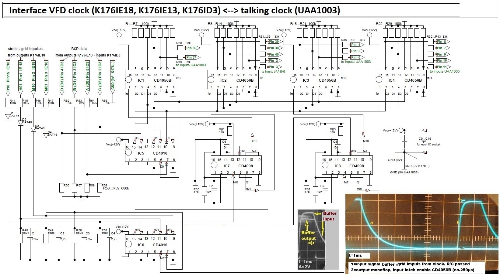 im Bild Adaptor_VFD_UAA1003.png findet man eine selbst entwickelte und getestete Adapterschaltung zum Anschluss einer russischen Digitaluhr mit gemultiplexter VFD-Anzeige an einen Sprachausgabebaustein mit IC UAA1003.